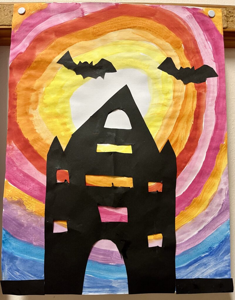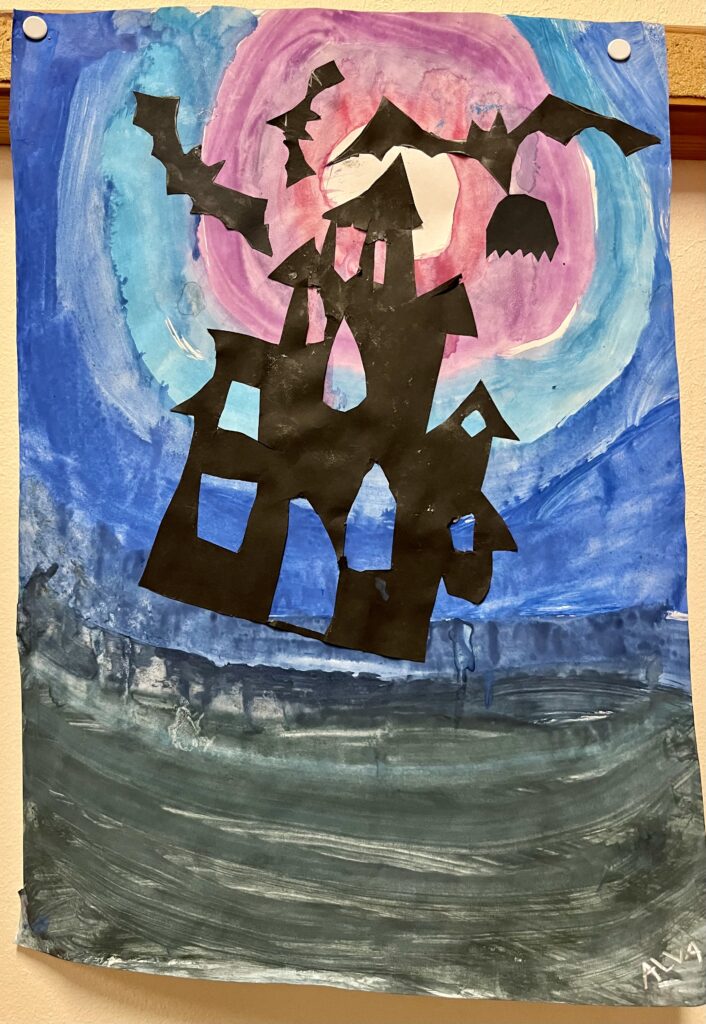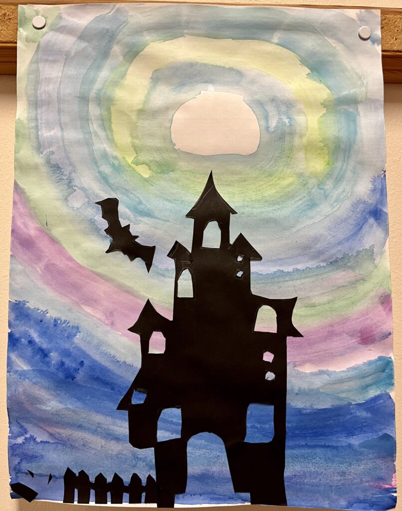 Zum bevorstehenden Halloweenfest hat die Klasse 2b (mitunter fliegende) Gruselschlösser gebastelt und gemalt.